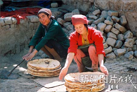 “馕”是维吾尔等民族日常生活的主食。以面粉发酵后在馕坑里烘烤而成,可以存放的时间很长,种类很多,大小不一。最大的馕直径有50厘米,周边厚,中间薄,戳有花纹,放少量盐和洋葱。最小的馕只有普通口杯大,最厚的馕有6厘米左右。此外还有肉馕、油馕、甜馕,又脆又香。