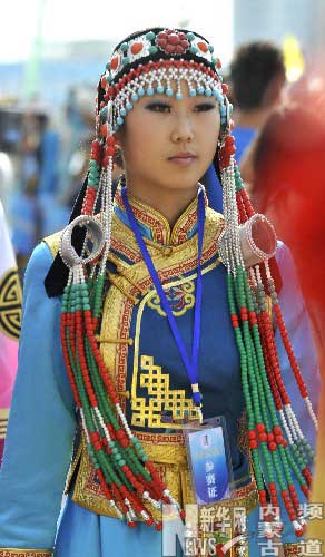 在呼和浩特举办的草原文化节上身着科尔沁蒙古族服饰的少女(7月15日摄)。清代科尔沁蒙古族因居住地与满族毗邻,其装饰风格深受满族文化影响,头饰为珊瑚珠串头围带插各式簪钗,袍服制作亦吸收满族服饰风格,注重绣花、贴花、盘花等工艺的运用。新华社记者李欣 摄