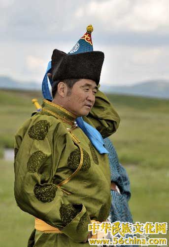 一位居住在锡林郭勒草原的苏尼特蒙古族男子身着传统蒙古袍(6月10日摄)。苏尼特长袍肥大而无开衩,男女长袍式样基本一致,妇女长袍略长一些。苏尼特男子长袍的面料多为蓝、深蓝和青色布帛,未婚女子以粉色布帛为面料,已婚妇女多以淡蓝、淡青和绿色布帛为面料。苏尼特地区,除年老妇女和妇女做家务时不系腰带以外,其余的男女均系腰带。新华社记者李欣 摄