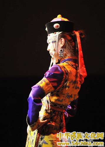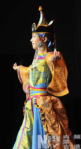 在呼和浩特举办的草原文化节上展示的苏尼特少女服饰(7月15日摄)。苏尼特长袍肥大而无开衩,男女长袍式样基本一致,妇女长袍略长一些。苏尼特男子长袍的面料多为蓝、深蓝和青色布帛,未婚女子以粉色布帛为面料,已婚妇女多以淡蓝、淡青和绿色布帛为面料。苏尼特地区,除年老妇女和妇女做家务时不系腰带以外,其余的男女均系腰带。新华社记者李欣 摄