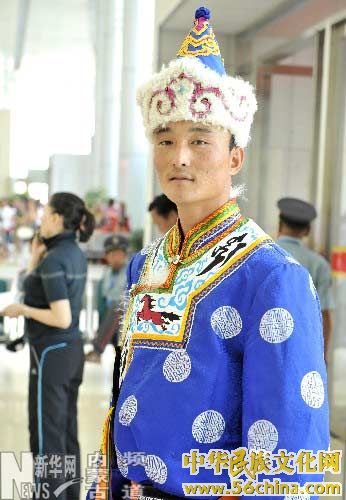 在呼和浩特举办的草原文化节上,一位蒙古族男子在展示察哈尔蒙古族青年男子服饰(7月14日摄)。察哈尔蒙古族服饰继承和发扬了传统蒙古族服饰的款式和风格,多采用元代皇宫的颜色,服装的领口、大襟不锈花,领边、领座、大襟、垂襟和开衩衣边用绸布进行镶边,体现了察哈尔蒙古族服饰华丽多彩的宫廷韵味。新华社记者李欣 摄