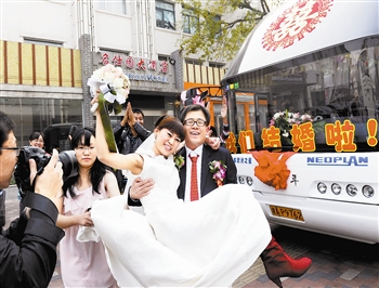天津北方网讯:租一辆公交车去迎亲,你能想到吗?天津街头出现的这辆新式婚车一上路,便吸引了大批市民的眼球。随着“80后”进入婚龄,婚姻观、消费观、审美观也不断转变,符合其成长特点的特色婚礼、主题婚礼越来越多,既节俭又时尚。王 津摄
