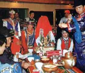 婚礼。蒙古族很注重婚礼仪式,尽管地区不同,形式各有差异,但都非常隆重、热闹。一般牧区的婚俗是:当娶亲回到男家后,新郎新娘不下车马,先绕蒙古包三圈。然后,新郎、新娘双双穿过两堆旺火,接受火神的洗尘。表示爱情的纯洁,新生活的兴旺。新郎新娘进入蒙古包后,首先拜佛祭灶,然后拜见父母和亲友。礼毕,由梳头额吉给新娘梳头。梳洗换装后,等待婚宴的开始。婚宴通常摆设羊背子或全羊席,各种奶食品、糖果应有尽有。婚宴上,新郎提银壶,新娘捧银碗,向长辈、亲友,逐一献哈达、敬喜酒。小伙子们高举银杯,开怀畅饮;姑娘们伴随着马头琴,放声歌唱。婚宴往往要延续两三天,亲友才陆续离去。而女方送亲者还要留人陪新娘住一至三日。有时,新娘的母亲也送亲,要住十多日。分别时,母女拥抱,痛哭,表示恋恋不舍。