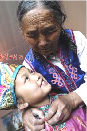 努乃老人还说,因为担心老祖宗传下来的蒙古族土尔扈特部落服饰制作工艺失传,她已开始教起儿媳妇这门手艺来,看得出来,老人对这门手艺很看重。
