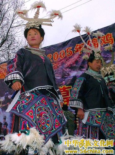 几位身上缀满鸡羽的苗族姑娘在表演有上千年历史的苗族锦鸡舞。