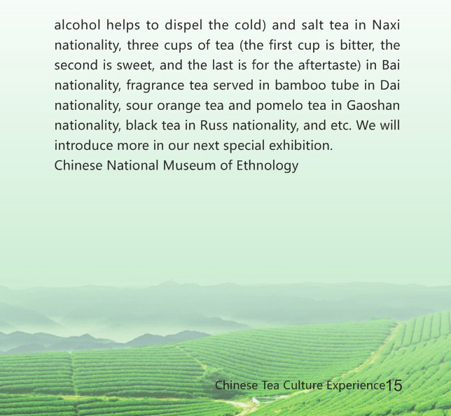 中国人的生活离不开茶,各少数民族亦如此。在各少数民族的日常生活中都有与茶相关的茶礼、茶俗,不同民族具有不同的茶文化特色。比如蒙古族的奶茶、藏族酥油茶、维吾尔族香茶、朝鲜族、大麦茶、人参茶、三珍茶、裕固族“三茶一饭”、瑶族咸油茶、回族八宝茶、土家族擂茶、苗族的雷公山茶、布朗族青竹茶、景颇族腌茶、布依族姑娘茶、哈尼族土锅茶、德昂族酸茶、基诺族凉伴茶和煮茶、怒族盐巴茶、拉枯族烤茶、佤族"烧茶、普米族的"打油茶"、傈僳族油盐茶和响雷茶、纳西族龙虎斗和盐茶、白族三道茶、傣族竹筒香茶、高山族:柚子茶 酸柑茶、俄罗斯族红茶等。更多的精彩我们将会在下个专题展览中为您介绍。