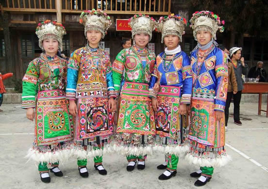 史载三苗先民女子“鸟章卉服”,说明古代的苗族人已经穿上了有花鸟图案的漂亮衣服。《楚辞·远游》载:“建雄虹而采旄兮,五色杂而炫燿。”这说明历史上苗族服饰面料讲究,绣工精细,图案奇特。为避开历代中原战乱,苗族西迁到西南的崇山峻岭,过着相对稳定的农耕生活,把织锦方法一直传承至今。