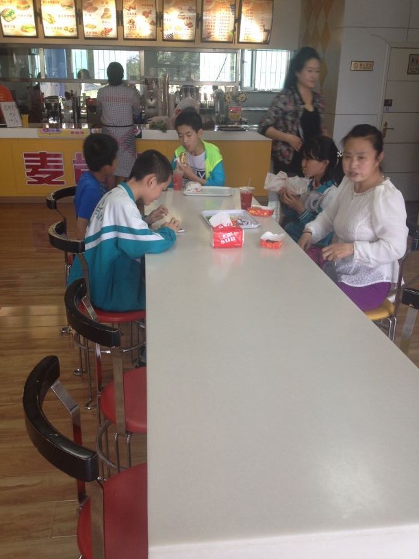 社区工作人员组织辖区内留守儿童去儿童公园、幸福广场游玩、做游戏,然后去麦肯姆西餐店吃汉堡、薯条、鸡米花等西餐。