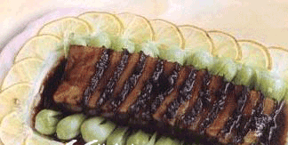 配料: 猪五花条肉500克。青菜150克。葱结15克、桂皮0、5克、姜丝25克、醋2克、八角0.5克、绍酒15克、白糖5克、肉汤50克、酱油35克、菜油1000克(实耗油100克)。 特色:皮起皱纹、 ...