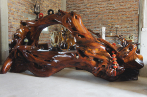 这些树根都是去哪里淘的呀?玩了18年根雕的老赵最早是从印度尼西亚淘了一批“印尼红木”,这批树根被制成记者眼前的这些大花台、博古架、大书桌、贵妃椅等,不但取材于古老的树木残根,而且材质好,根体相对完整,让观者感受强烈。老赵说,如今在印尼淘树根的多为日本人和韩国人,国内根雕玩家则多活跃在云南边境一带。今年,老赵去了三趟云南边境,走进山窝窝里淘树根,最长的一次逗留了近一个月,最后运回上百吨树根。