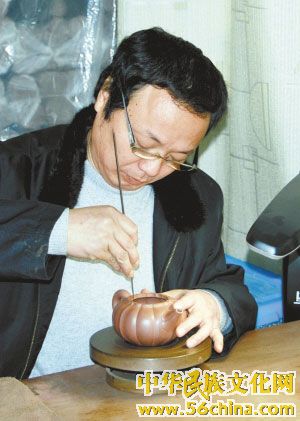 蒋彦的坚守是值得的。在他的“大汉工作室”,来访者无不被他古朴霸气的作品震撼。代表作“楚汉雄风”的制作完全可以看做蒋彦与作品的一次灵魂交流的过程。众所周知,子冶石瓢是紫砂经典,完美的造型难以逾越。蒋彦曾以追求极限的心态仿造这把壶。仿造过程中,他一直在体会当年作者的思维和意境,在连续打了9个样后,他慢慢地体悟到了作品的灵魂和气韵——一种金字塔的形体语言在壶中与中国陶文化水乳交融。这一发现让蒋彦无比震撼,因为这是中外设计理念隔着时空的对话。震撼之余,蒋彦把自己对汉文化的体会与之结合,造就了雄浑霸气的“楚汉雄风”。像这样的对话在每件壶中都可以体味得到。蒋彦的另一代表作“陶家佳人”完成于2009年,取形于憨态喜人的葫芦。这把壶线条流畅自然,光洁的壶身没有任何装饰,圆润的提梁如彩练当空。一切都那么简洁、质朴,就像一位汉代田间的女子手挽陶罐款款而来。“金沙宝鼎”是蒋彦的得意之作,取名宝鼎之源,以商周最尊贵的方鼎作为主体,直玄纹和回旋纹两线条组合的壶身,前有方仪壶嘴领仗,后有无尽龙凤把对,顶有华盖富佑四方,一派歌舞升平群仙朝和的盛世美景。这种对富贵平安毫不掩饰的追求和向往,是那么坦白、直接,正是汉代文化的可爱之处。