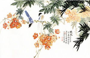 金鸿钧擅长小写意花鸟画的创作,他把小写意花卉与工笔重彩鸟结合,将花鸟画中最精彩的两个部分结合起来。《暖风》中春天怒放的凌霄花点点簇簇,生机盎然,位于画中心的一对山喜鹊欢叫跳跃于枝头,让人们仿佛在明媚的春光中听到了喜鹊欢愉的鸣叫。画面境界开阔,景深加大,满眼一片欣欣向荣、朝气蓬勃的鲜活气息。整幅作品色彩淡雅、繁茂清新、形神兼备、生动传神,不愧为画家的匠心独运之作。