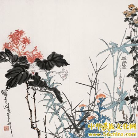 更值得我们注意的是另两首诗。诗取特写角度,视点逼近,水流花开尽出笔下,如《龙壑轩题壁》:“绝壁苍茫绘白虹,微寒犹下碧宵风。云轩不见云英在,一树槿花寂寞红”;《金钗兰》:“兰生绝壁上,风露以为餐。开落白云里,不求人世欢。”石壁千仞,槿花灿烂,幽兰深谷,遗世独立,诗歌意象烂漫,境界苍茫。其设色之浓郁,剪裁之巧妙,形式之卓绝,一如他的山花画作。潘天寿此时的雁荡山水画,正可在他的雁荡游记诗中找到相应的视角和境界。